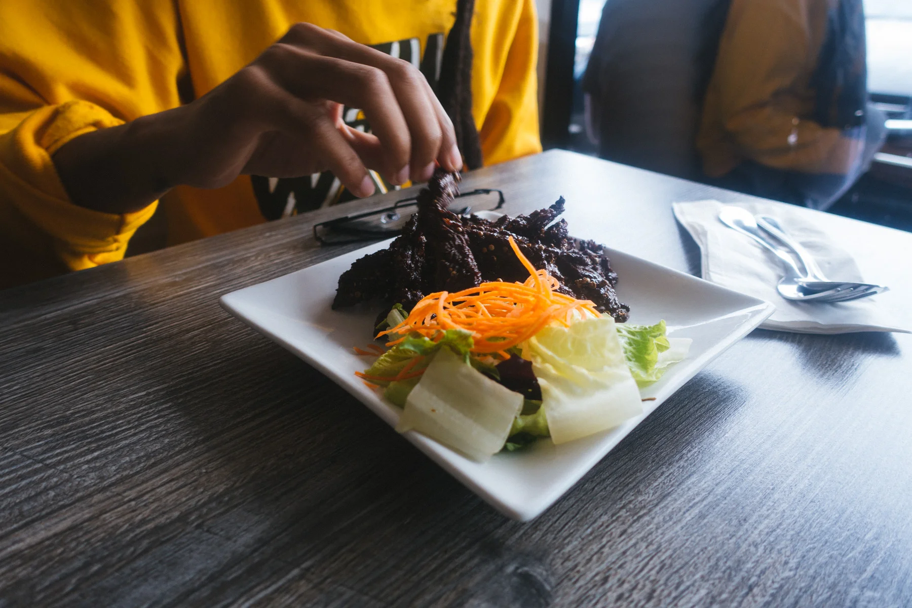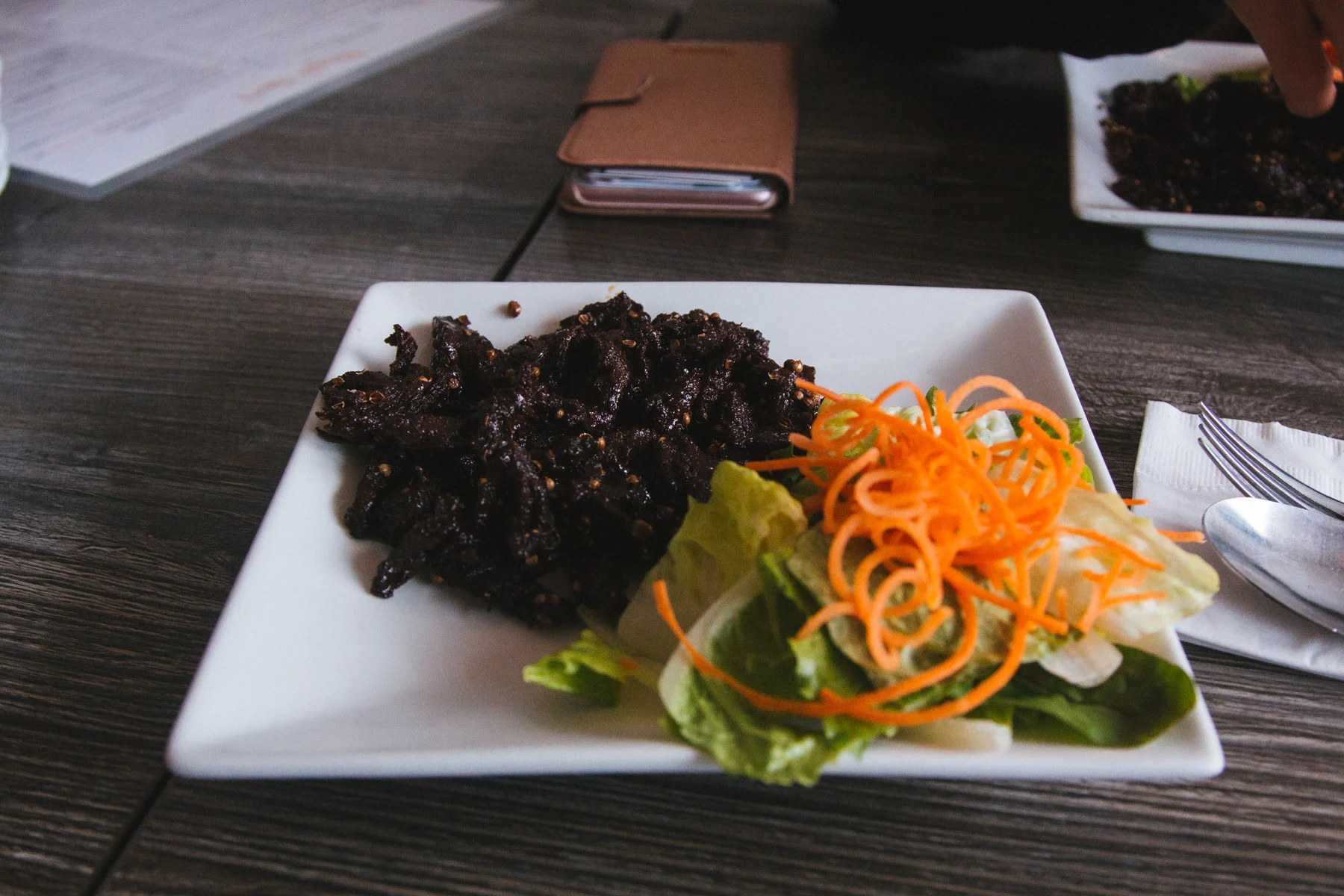 Returned to my favourite, favourite vegan restaurant in LA - Vegan glory! my third time here, and this here is my favourite thing to get there. Vegan Beef Jerky, made from seitan. So delicious. I myself am not vegan, but this is amazing.